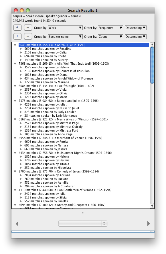 Intuition tells me that it will be an easier task for a computer to isolate female characters than it will be to isolate male characters, so I select “female”, and click “find”. A few minutes later, WordHoard produces the total words spoken by all female characters in each play – and I add the criteria to show “words by speaker name”. My screen looks like this (click to make bigger):