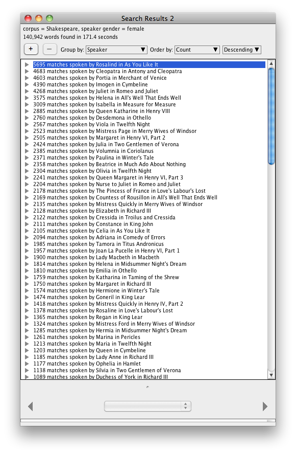 Except that counting is not actually all that simple: decisions have to be made about what to count and how to decide what to count, and then how you are going to do that. I happen to be interested in gender, which I think is one of the more quantifiable social identity variables in textual objects, though it certainly isn’t the only one. Let’s say I wanted to find three historically relevant gendered noun binaries for Shakespeare’s corpus. Looking at the historical thesaurus of the OED for historical contexts, I can decide on lord/lady, man/woman, and knave/wench, as they show a range of formalities (higher – neutral – lower) and these terms are arguably semantically equivalent. The first question I would have is “how often do these terms actually appear in 38 Shakespeare plays?”